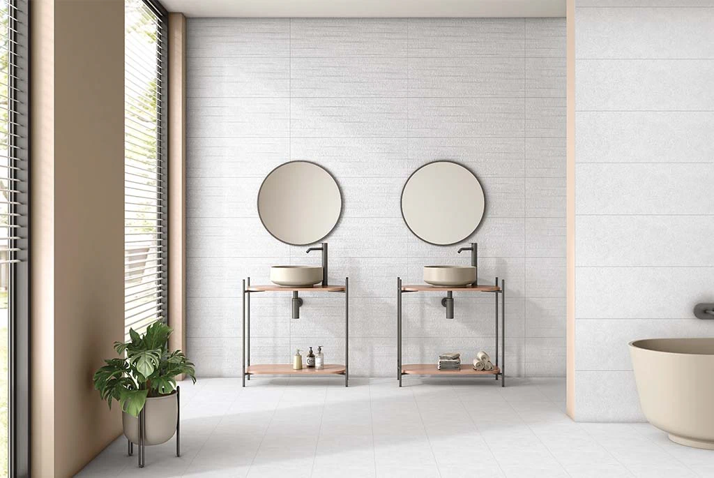 Нейтральный белый цвет позволит сочетать плитку с натуральным камнем, мрамором, бетоном, деревом, стеклом и металлическими поверхностями, любой мебелью и сантехникой.