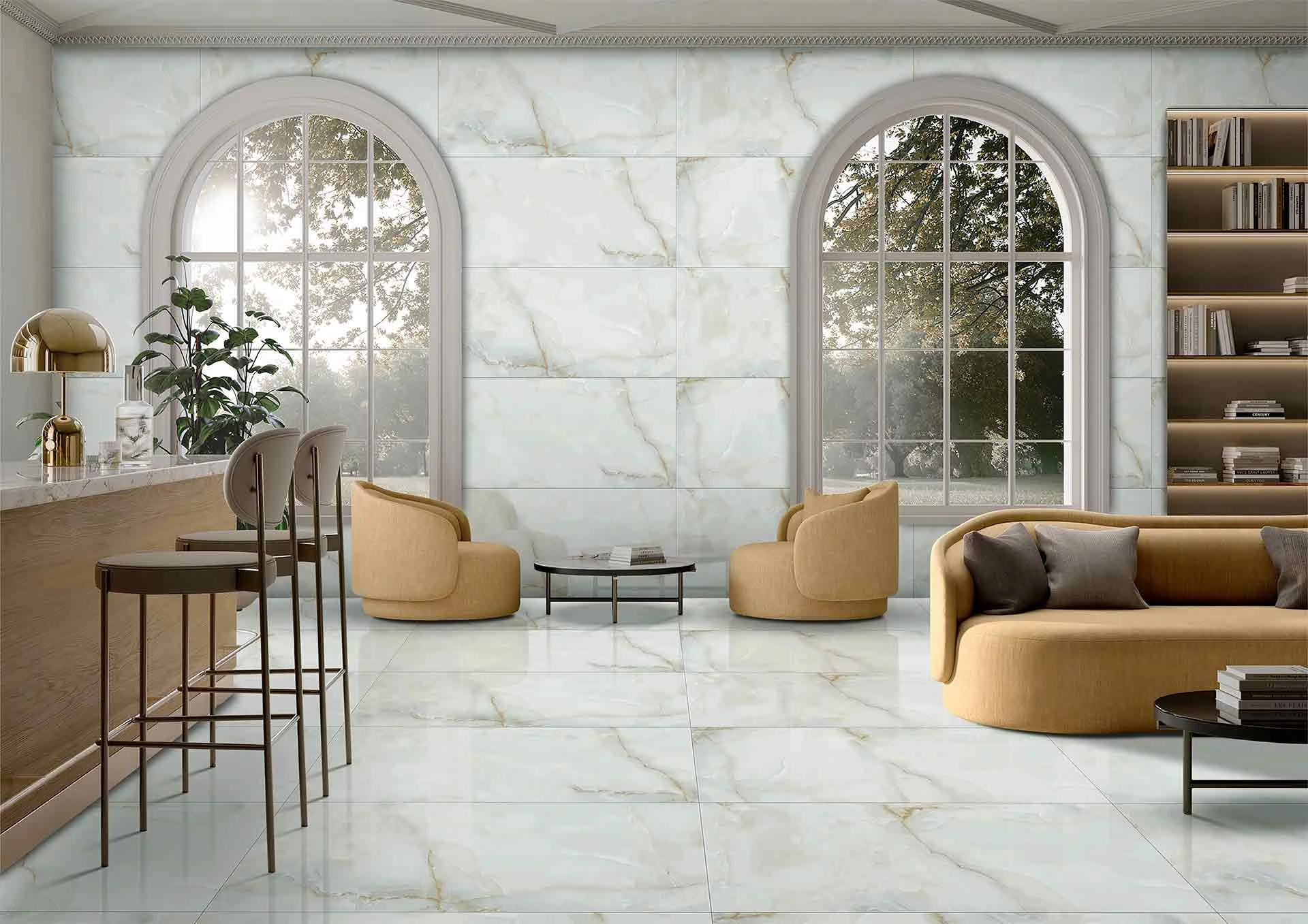 Натуральный мрамор привносит в помещение аристократизм и благородство, а теплые полированные текстуры дают спокойствие, уют и визуально расширяют пространство.