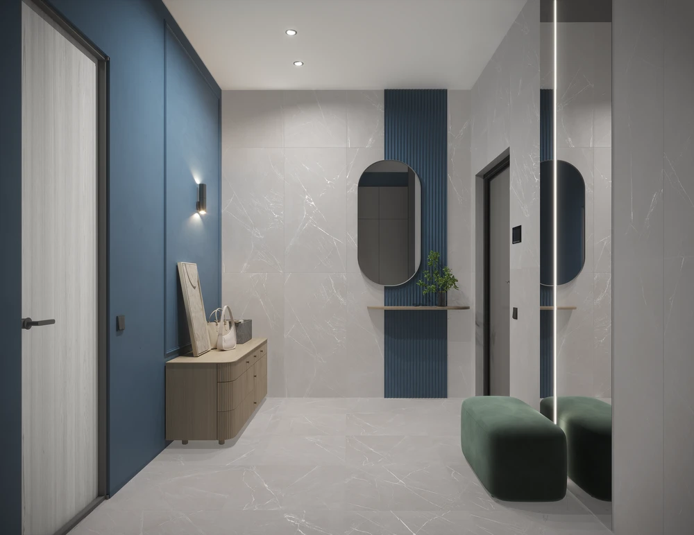 За счет спокойных тонов плитка хорошо сочетается с природным камнем, ониксом, бетоном, тераццо, деревом, деталями интерьера из стекла, зеркал и металла. Возможность комбинации в дизайне теплого и холодного оттенков мрамора дает уникальную возможность создавать на основе коллекции контрастные интерьеры, обеспечивающие спокойную мягкость, уют и отражение света от полированной поверхности.