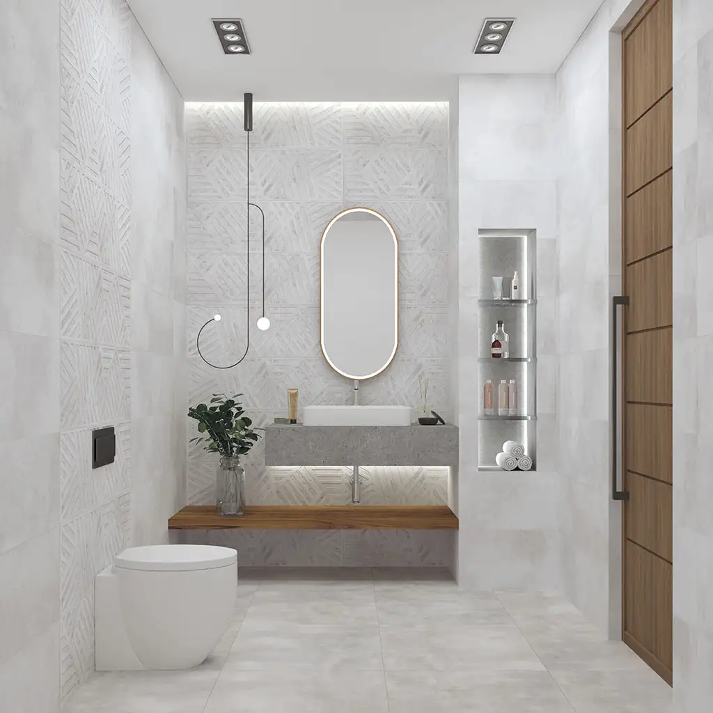 За счет нейтрального цвета, она отлично сочетается с любым материалом: натуральным камнем, мрамором, терраццо, деревом, стеклом металлом или зеркальными поверхностями.