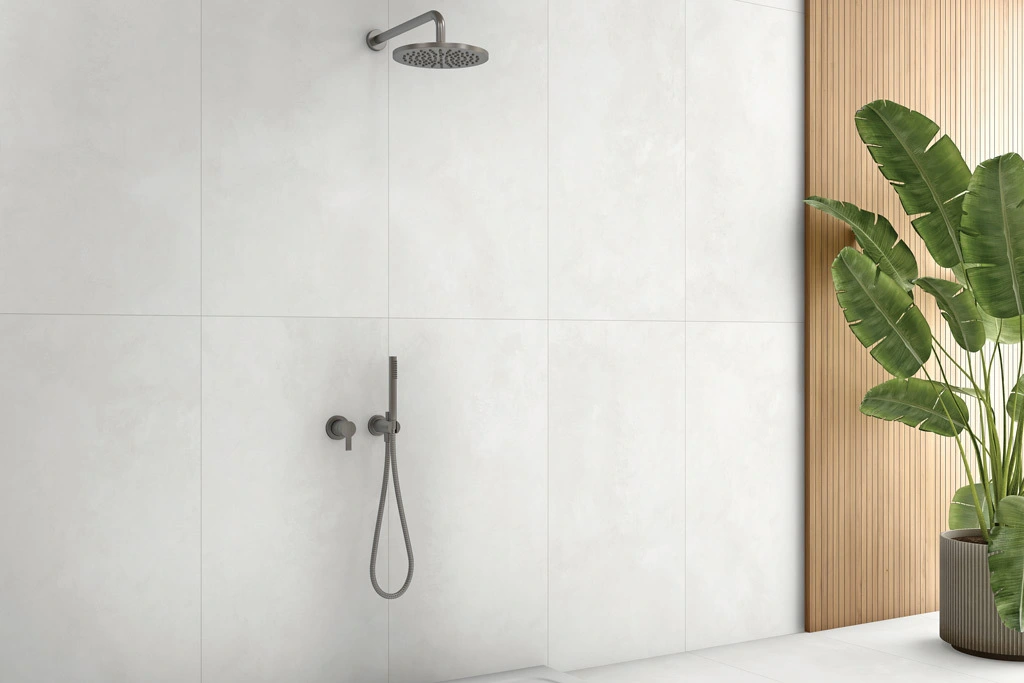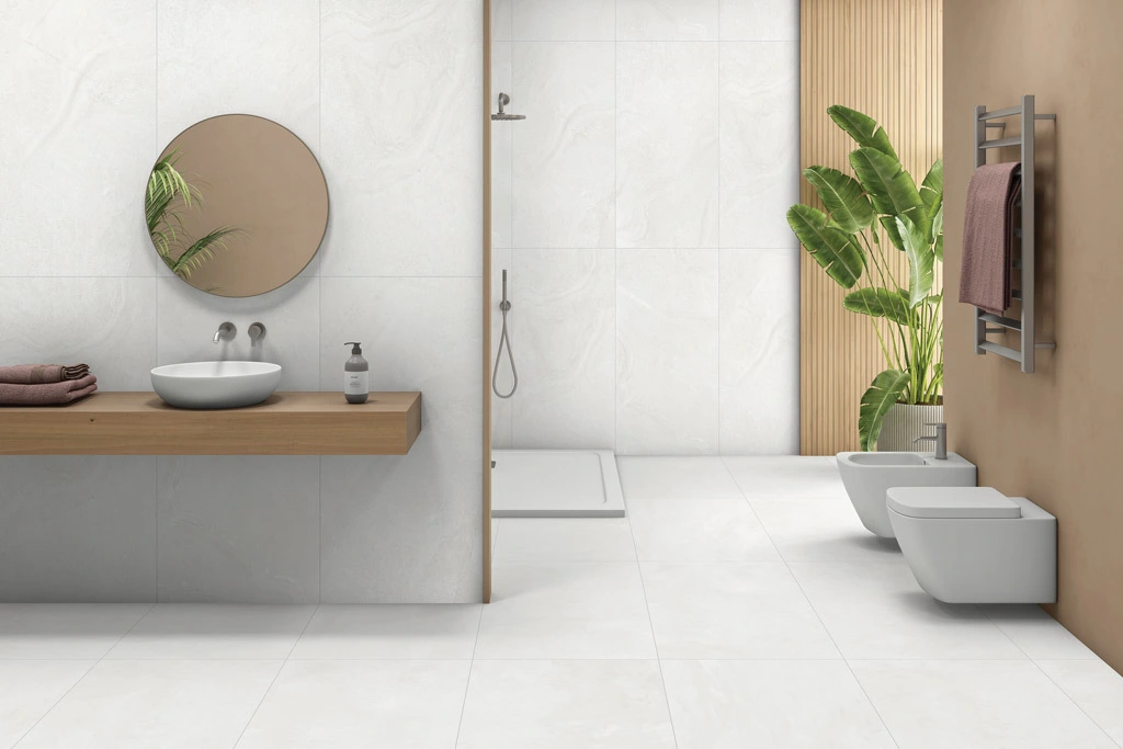 Нейтральный белый цвет позволит сочетать плитку с натуральным камнем, мрамором, бетоном, деревом, стеклом и металлическими поверхностями, любой мебелью и сантехникой.