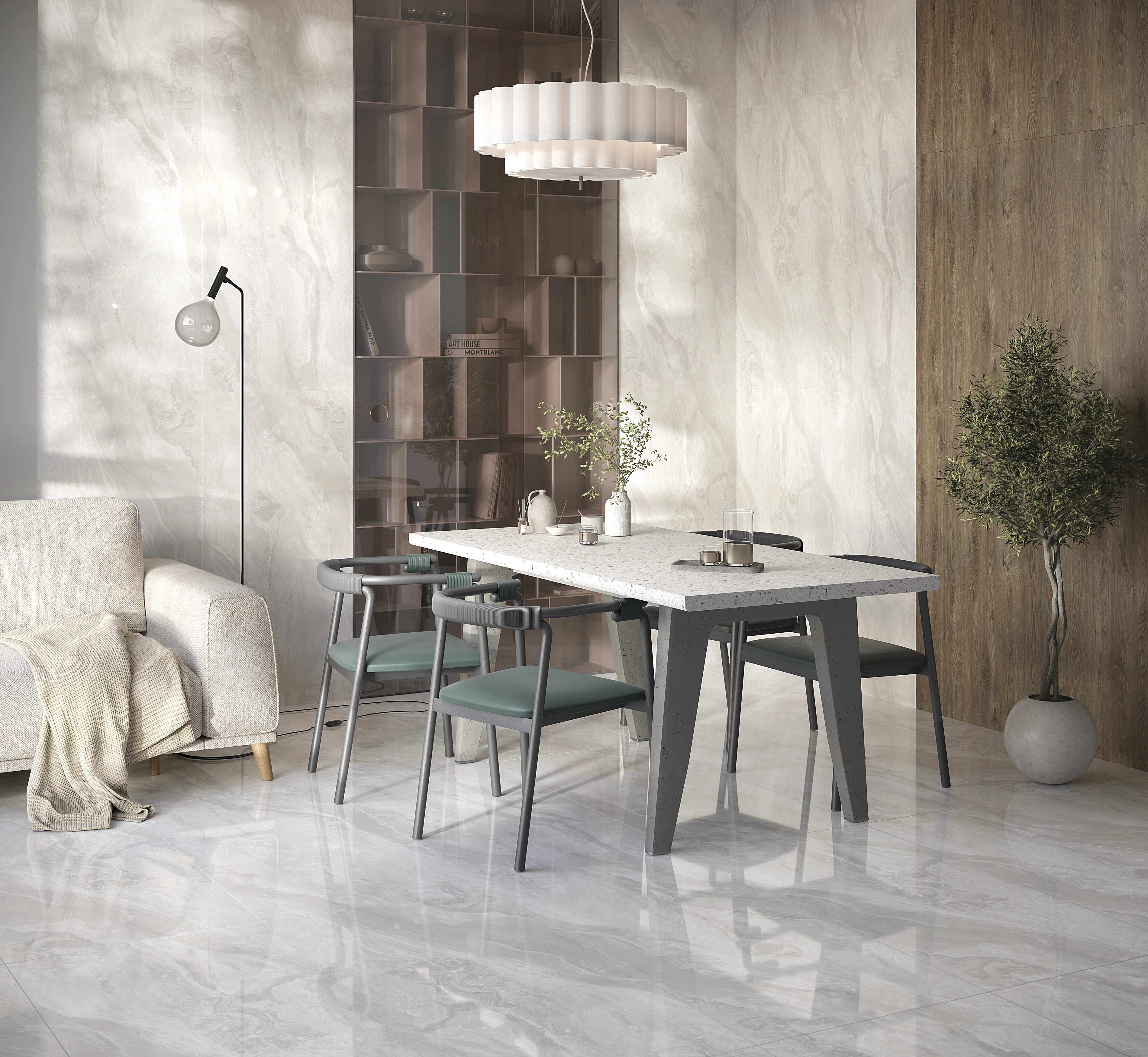 Керамогранит Statuario Rock легко сочетается с другими материалами – натуральным камнем, например ониксом, деревом, бетоном, металлическими поверхностями, кожей и стеклом. Светлые, полированные текстуры визуально увеличивают объем помещения и придают ему благородный, аристократический вид.