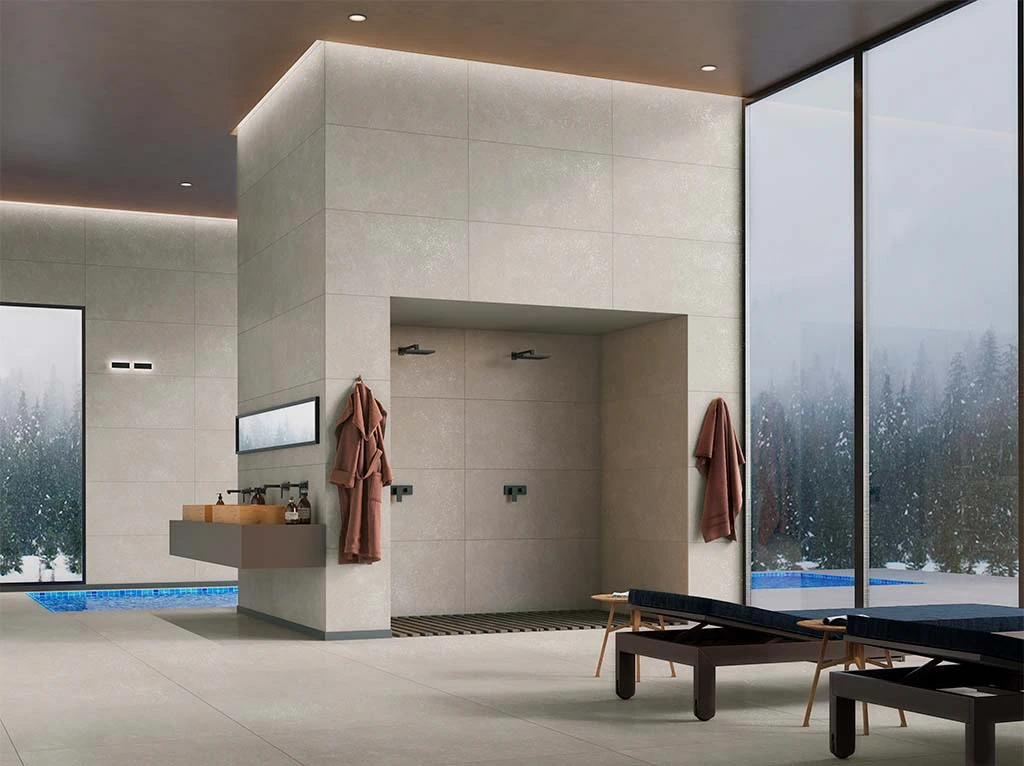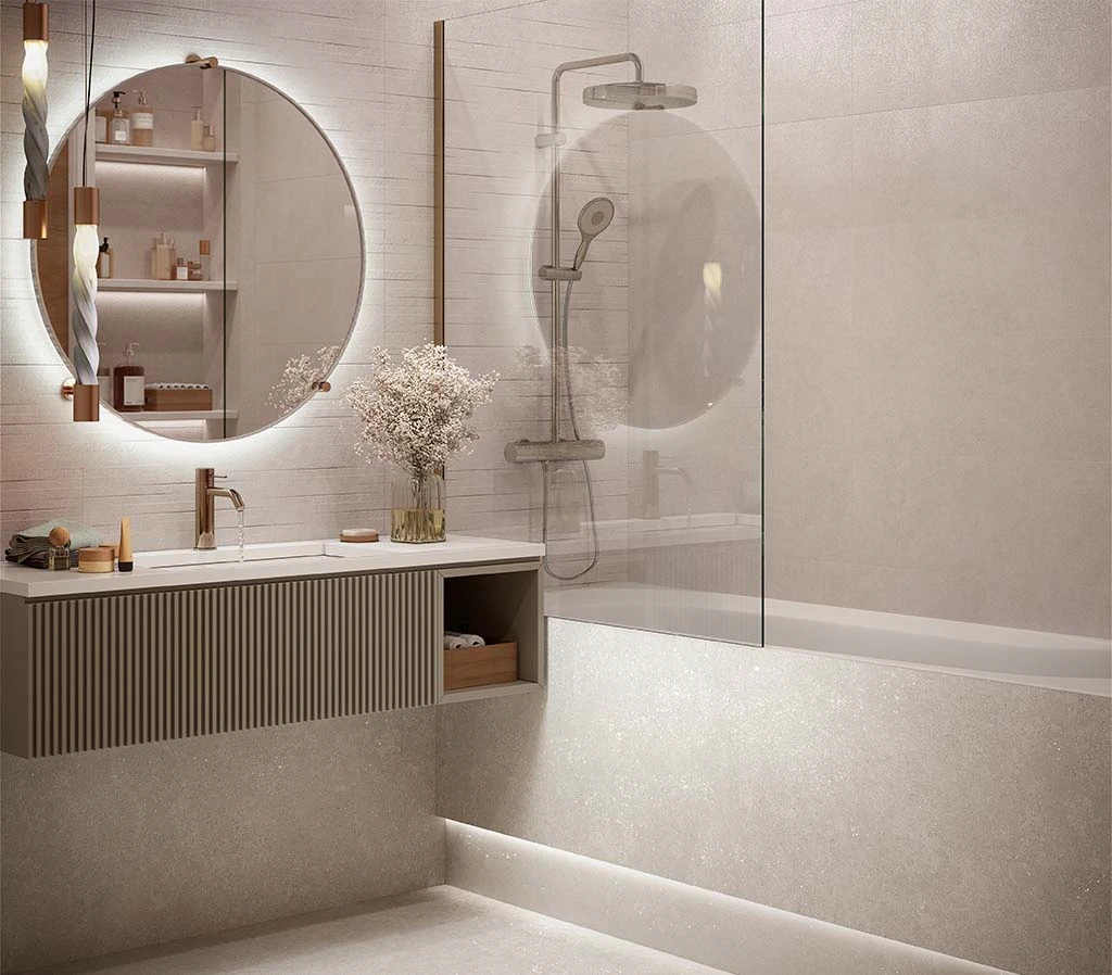 Нейтральный цвет легко сочетается с другими отделочными материалами – натуральным камнем, деревом, стеклом, а также сантехникой, мебелью и декоративными элементами интерьера.