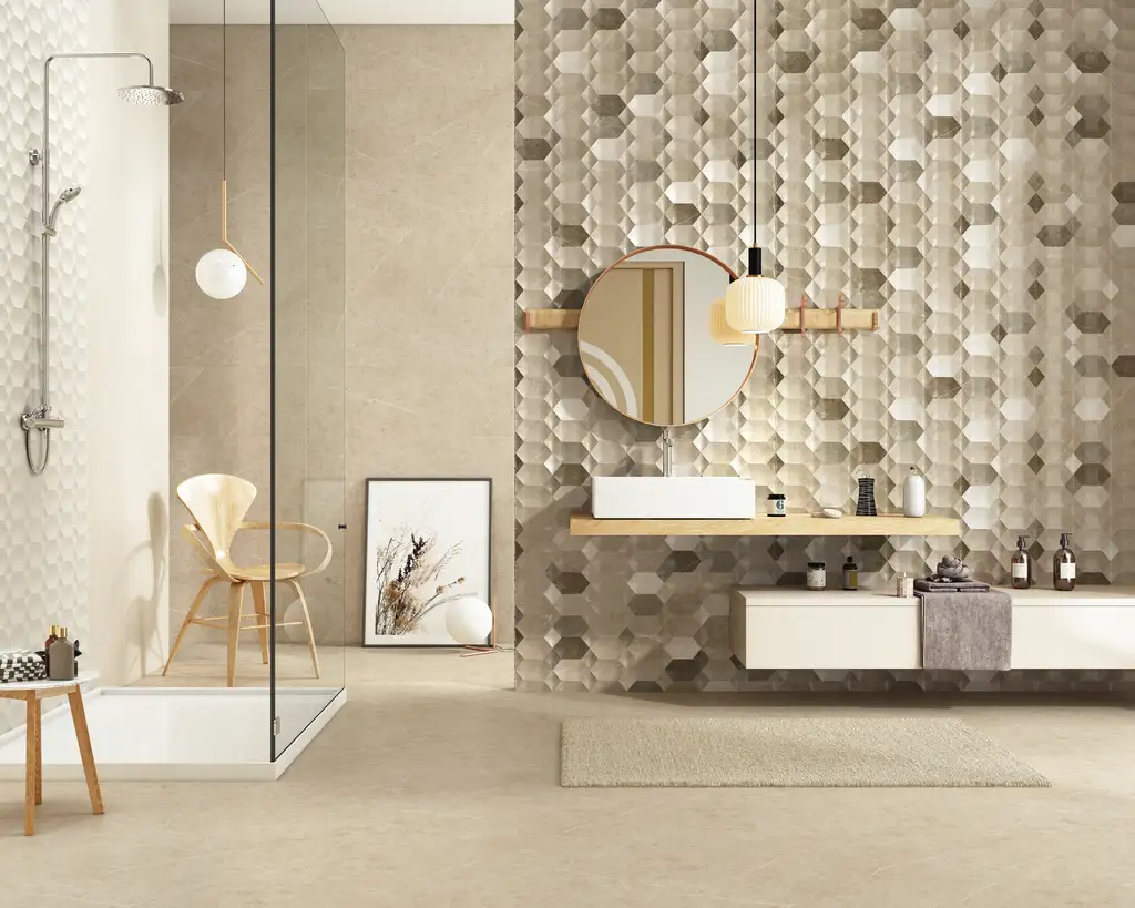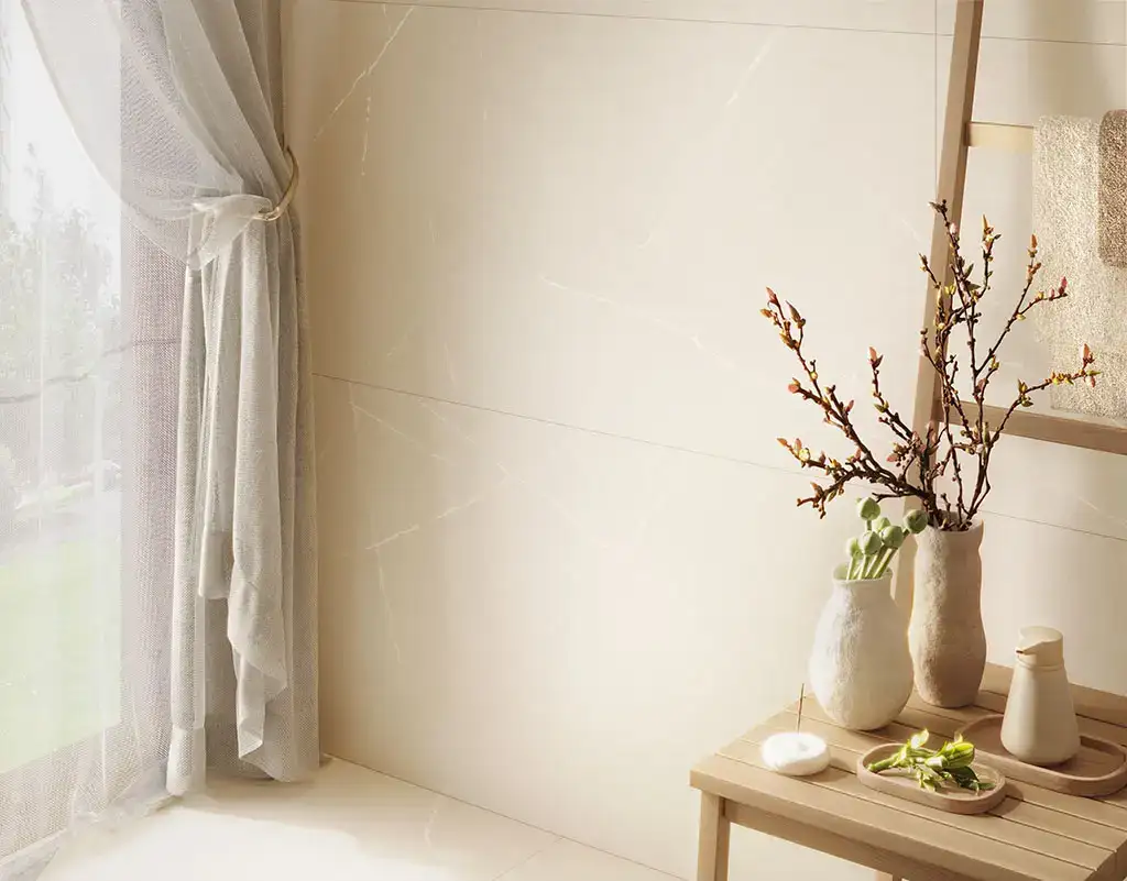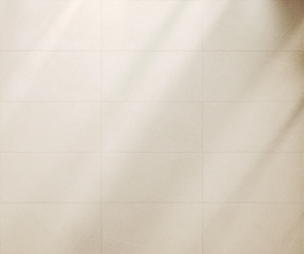 Спокойный пастельный цвет плитки создает теплую, уютную атмосферу, лаконичную и комфортную, а полированная поверхность визуально расширяет пространство.