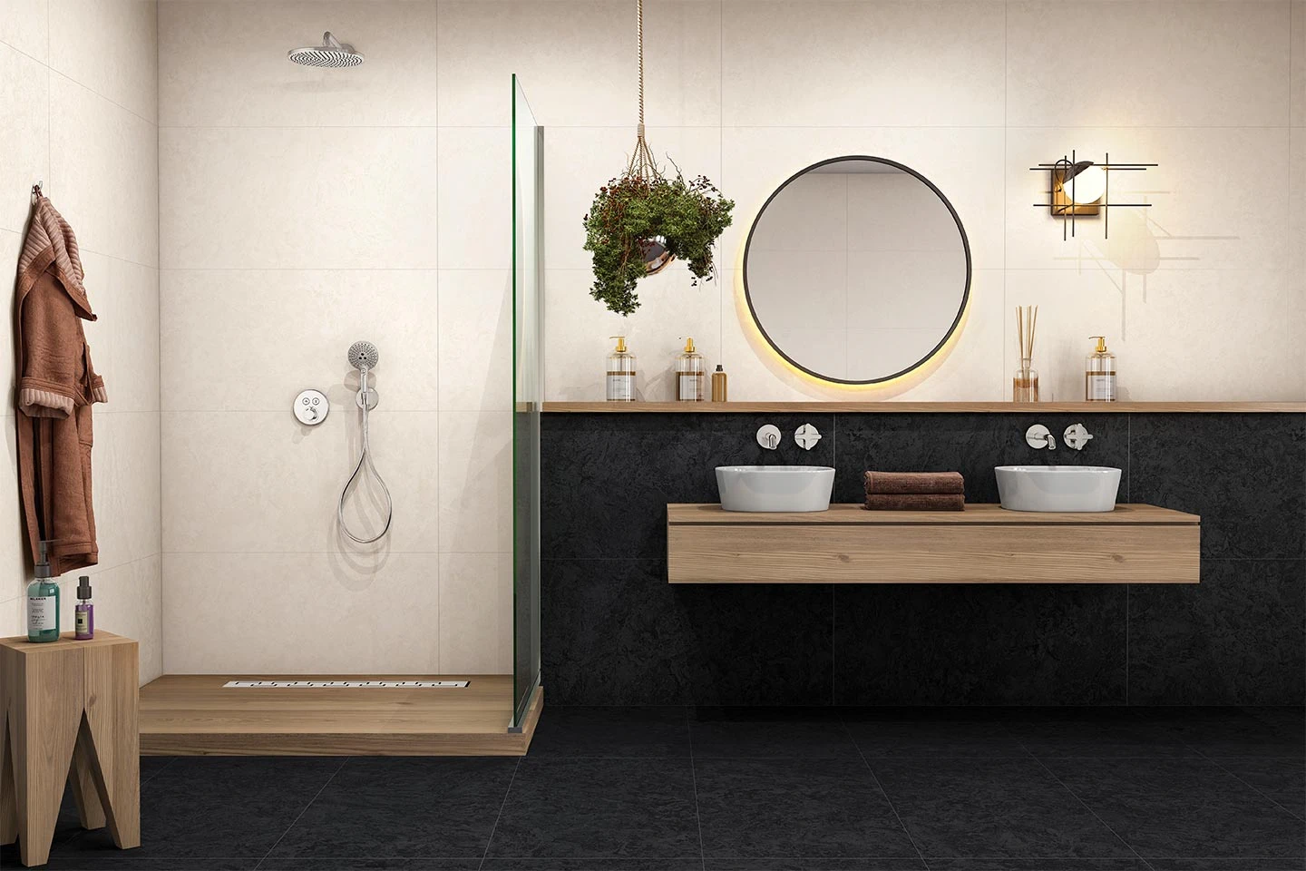 Gravita Caldera будет хорошо сочетаться с другими материалами – мрамором, камнем, бетоном, металлическими поверхностями, стеклом. Также хорошо впишется в интерьер с керамогранитом сантехника и мебель.