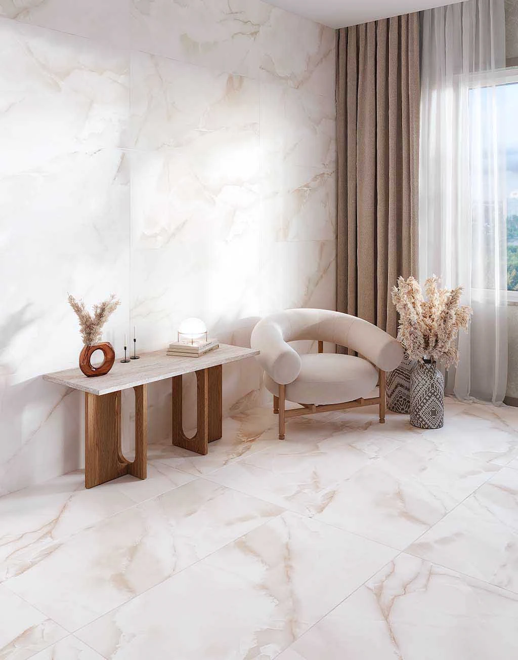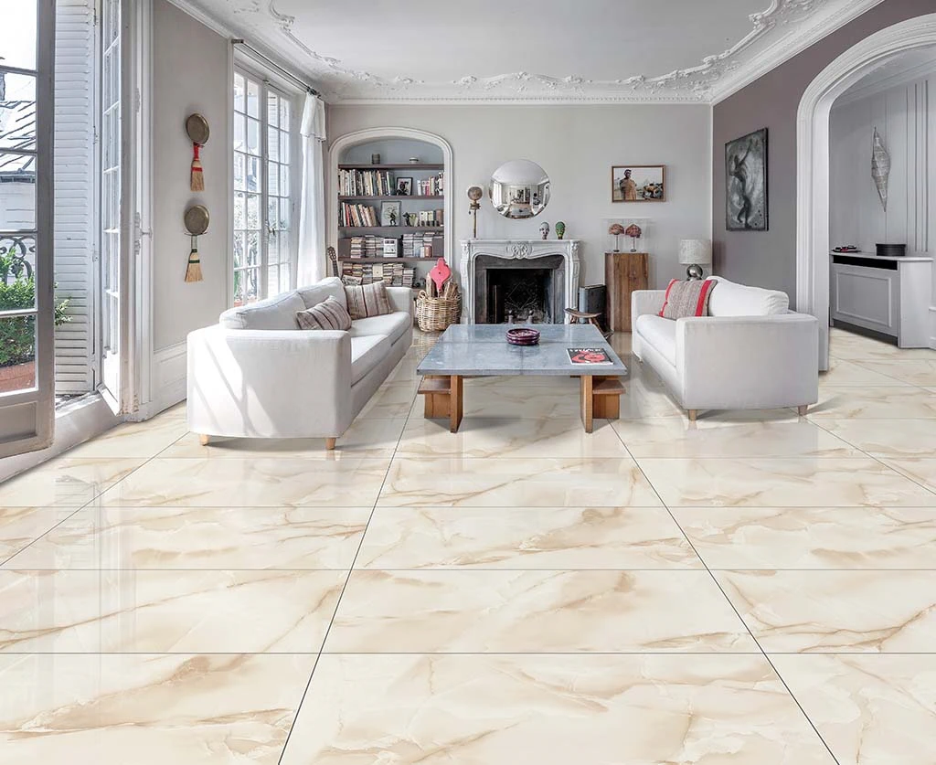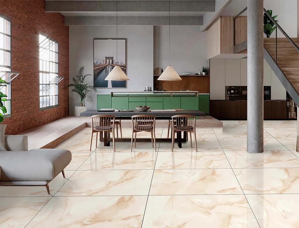 Спокойный, теплый цвет керамогранита создаст в помещении ощущение тепла и легкости и света, а полированная поверхность визуально расширит пространство.