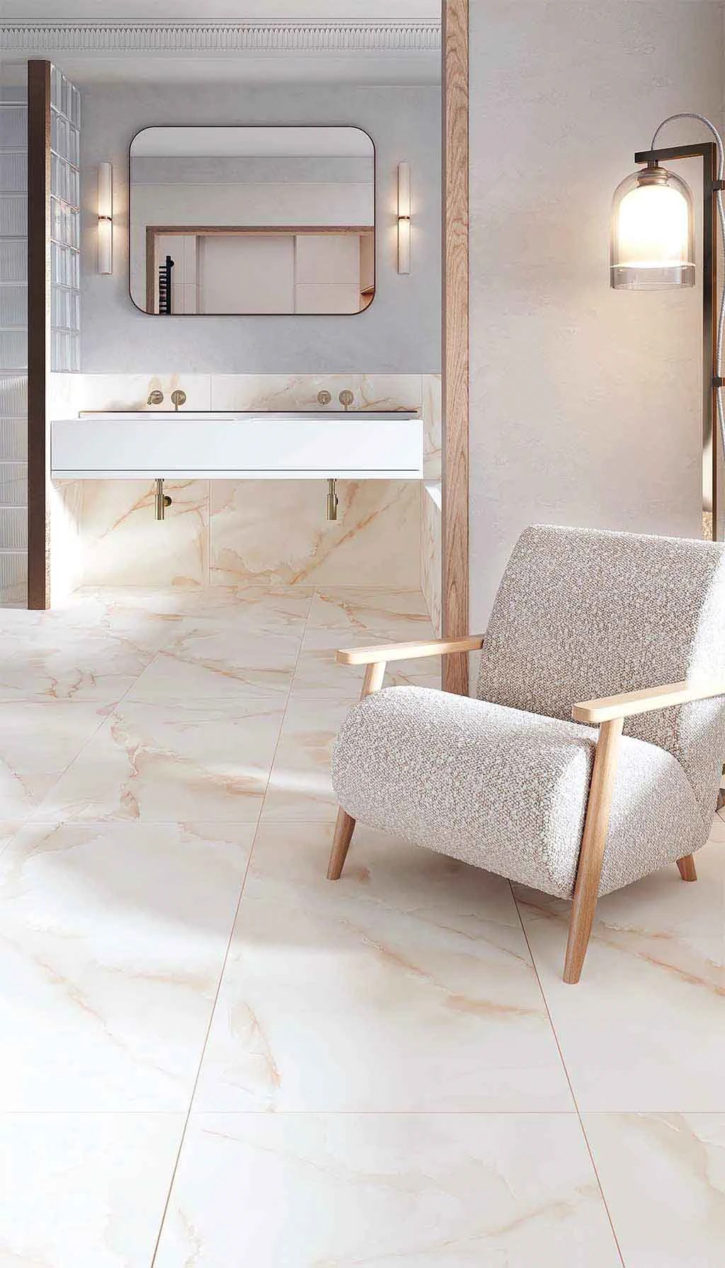 Gravita Heilo Onyx будет легко сочетаться с другими элементами отделки, такими, как мрамор, природный камень, дерево и стекло. Плитка хорошо смотрится с сантехникой разных оттенков, металлическими и хромированными элементами декора и зеркалами.