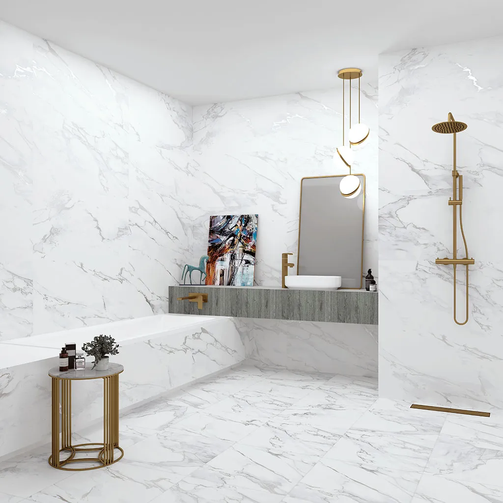 Нейтральный белый цвет позволит сочетать плитку с натуральным камнем, мрамором, бетоном, деревом, стеклом и металлическими поверхностями, любой мебелью и сантехникой.