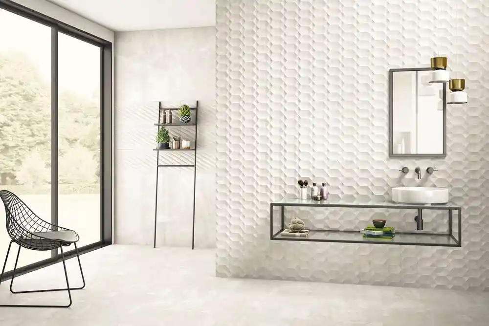 За счет благородной текстуры очень редкого серого оникса с белыми прожилками эта плитка будет прекрасно сочетаться, как с интерьерами в стиле минимализма или скандинавским стилем, так и с модерном или лофтом. Нейтральная, пастельная теплая палитра позволяет отлично комбинировать плитку Gravita Oniх с разными материалами: мрамором, бетоном, деревом, стеклом и т.д. Точно также не возникнет сложностей с предметами интерьера и декора, мебелью или сантехникой. Плитка подходит для отделки стен ванной и туалета, кухни и прихожей, гостиной и спальни. Спокойные тона базы и 3D узоры позволяют создать необычный и элегантный дизайн, а сочетание с темными поверхностями создает эффект ярких пятен в интерьере.