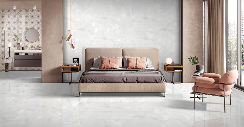 На поверхности плитки расположены активные теплые прожилки, которые дополнительно раскрываются за счет полированного покрытия.