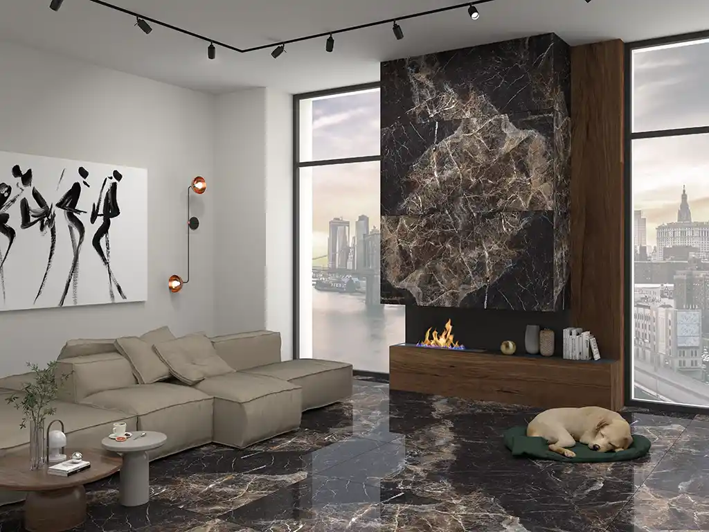 Gravita Noble хорошо сочетается с другими материалами – бетоном, натуральным камнем, металлическими элементами, стеклом и часто используется с контрастными темными поверхностями.