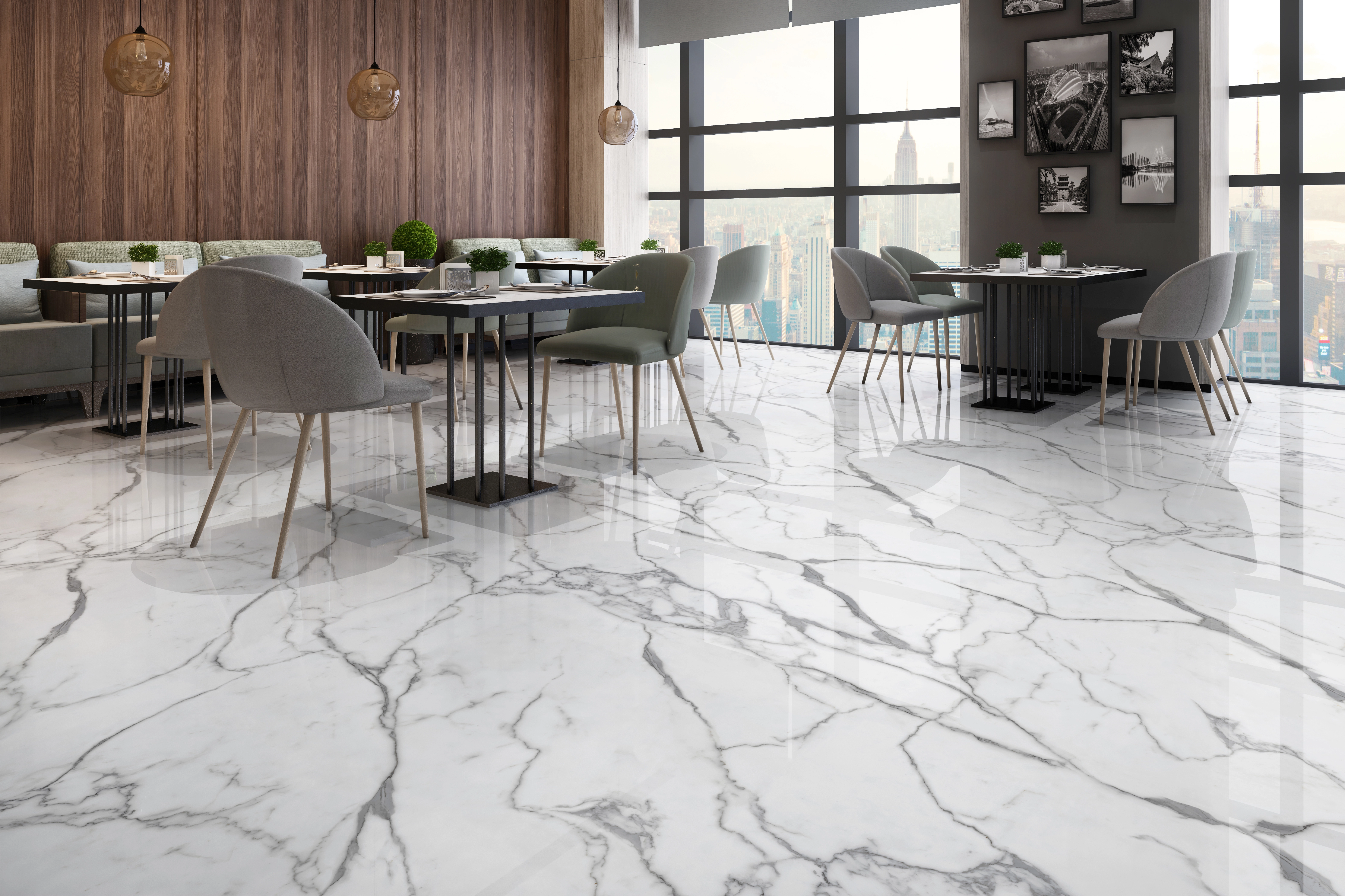 Керамогранит коллекции Gravita Calacatta Smoke с полированной поверхностью под белый мрамор с серыми прожилками в двух форматах, 60х120 и 60х60 см.