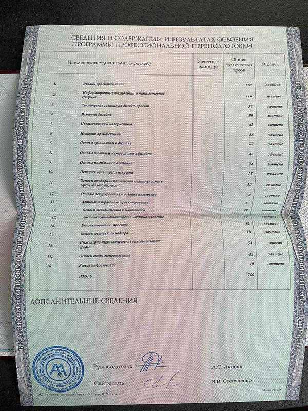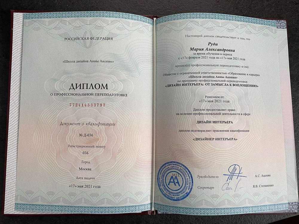 Закончила «Школу дизайна Анны Акопян» в 2021 году.